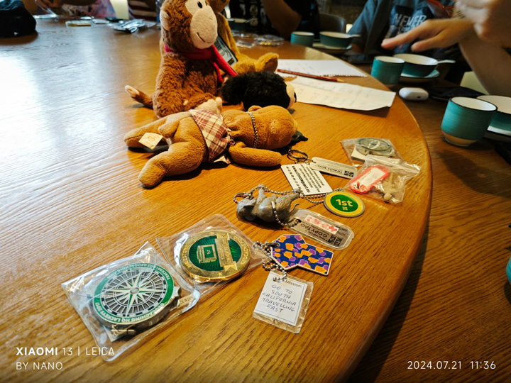 24 年 3 月参加第一次 Event Cache,终于线下见到北京宝友,也第一次接触实体 Trackables(简称 TB)。这些小物件(钥匙扣、徽章、纪念币等)带有唯一编号,玩家可以将其放在藏宝点中,让其他玩家帮忙「移动」到新的地点,并在线记录它们的旅程。TB 就像 Geocaching 的「共享旅行日记」,由玩家接力完成故事。每个 TB 都有独特目标,比如 6 月在日本遇到的 TB 就想造访更多灯塔,只不过我离海边还是太远了,没见到几个灯塔,这个 TB 现在还在我手上。参加 Event Cache 的时候,宝友们也会拿出自己收藏的 TB 一起分享并交换,例如 24 年 7 月我去广州参加聚会的那次就是一桌子满满的 TB!